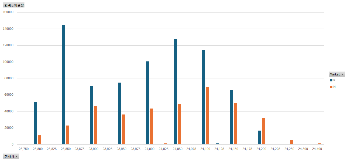 부연 설명이 필요한 것은 24,200원 이상의 가격은 장전 거래에서 많이들 거래가 되었고, KRX로오니 외국인/기관의 거래량이 실리면서 아래에 보이는 하루의 거래 추이에 맞게 거래가 되었다고 볼 수있다.